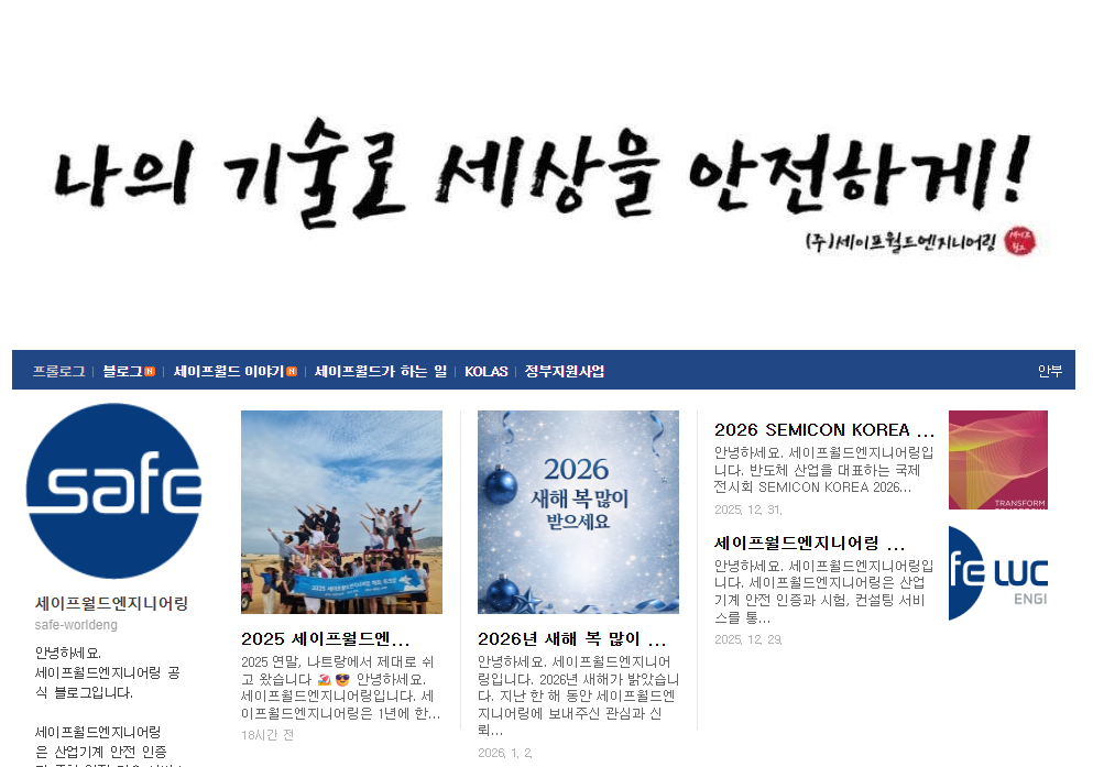 ¼¼ÀÌÇÁ¿ùµå¿£Áö´Ï¾î¸µÀÇ ´Ùä·Î¿î ¼Ò½ÄµéÀ» ¸¸³ªº¸¼¼¿ä. ±¸µ¶ÀÚ ¿©·¯ºÐ°ú ´õ ±íÀÌ ¼ÒÅëÇϱâ À§ÇØ ¼¼ÀÌÇÁ¿ùµå °ø½Ä ºí·Î±×°¡ »õ·Ó°Ô ž½À´Ï´Ù!µðÀÚÀκÎÅÍ ÄÜÅÙÃ÷±îÁö ½Ï ¹Ù²ï ºí·Î±×¿¡´Â ÀÌ·± À̾߱âµéÀÌ ´ã°Ü ÀÖ½À´Ï´Ù. ¼¼ÀÌÇÁ¿ùµåÀÇ Àü¹®ÀûÀÎ »ê¾÷ ¾ÈÀü ÀÎÁõ ±â¼ú¿¡ °üÇÑ ¸ðµç À̾߱â "¿ì¸® ¿öÅ©¼¥ ´Ù³à¿Ô¾î¿ä! ✈️" Àü Á÷¿øÀÌ ÇÔ²² ¶°³µ´ø Èú¸µ ¿©Çà±â! ¼¼ÀÌÇÁ¿ùµåÀÇ KOLAS °øÀÎ ½ÃÇè ±â°ü ³»¿ë°ú ´õºÒ¾î, ¾î·Æ°Ô¸¸ ´À²¸Á³´ø Á¤ºÎ »ç¾÷ Âü¿© °¡À̵嵵 ¾÷µ¥ÀÌÆ® µË´Ï´Ù!¼¼ÀÌÇÁ¿ùµå¿£Áö´Ï¾î¸µÀº ÆÄÆ®³Ê»ç ¹× °í°´ ¿©·¯ºÐ°úÀÇ ¿¸° ¼ÒÅëÀ» ÁöÇâÇÕ´Ï´Ù.